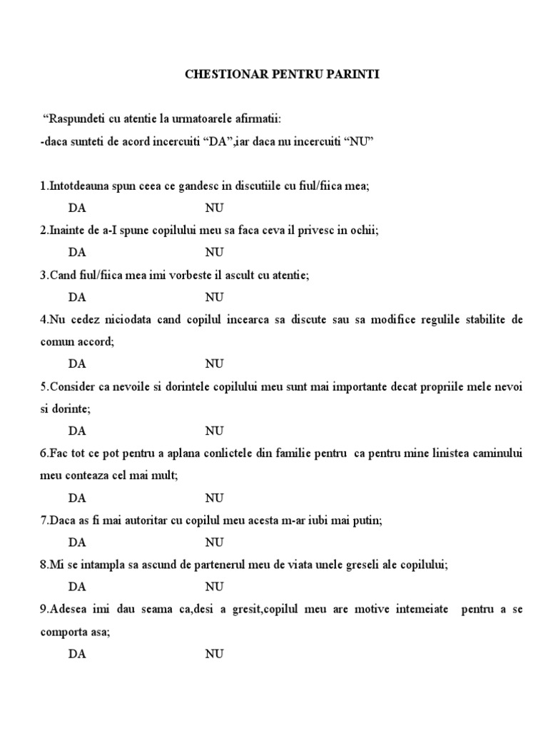 Chestionar Pentru Parinti