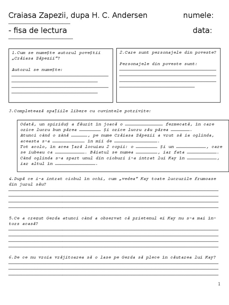 Citeste Craiasa Zapezii De H C Andersen Si Cimpleteaza Urmatoarea Fisa Brainly Ro
