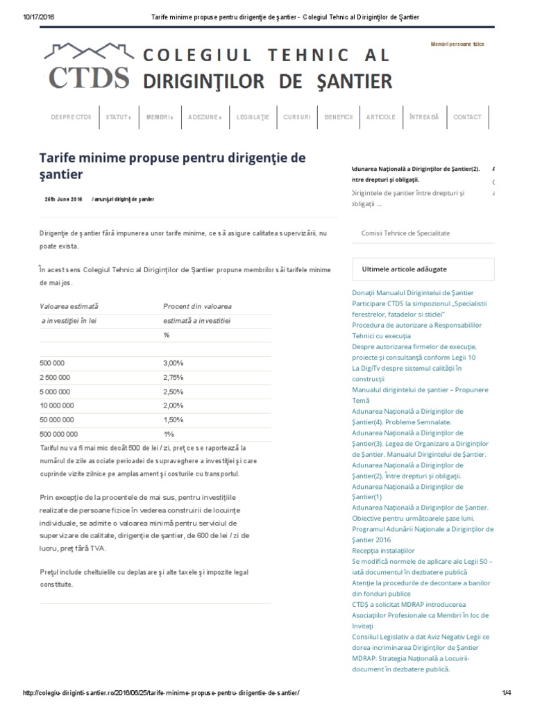 Tarife Minime Propuse Pentru Dirigenţie De Santier Colegiul Tehnic Al Diriginţilor De Santier