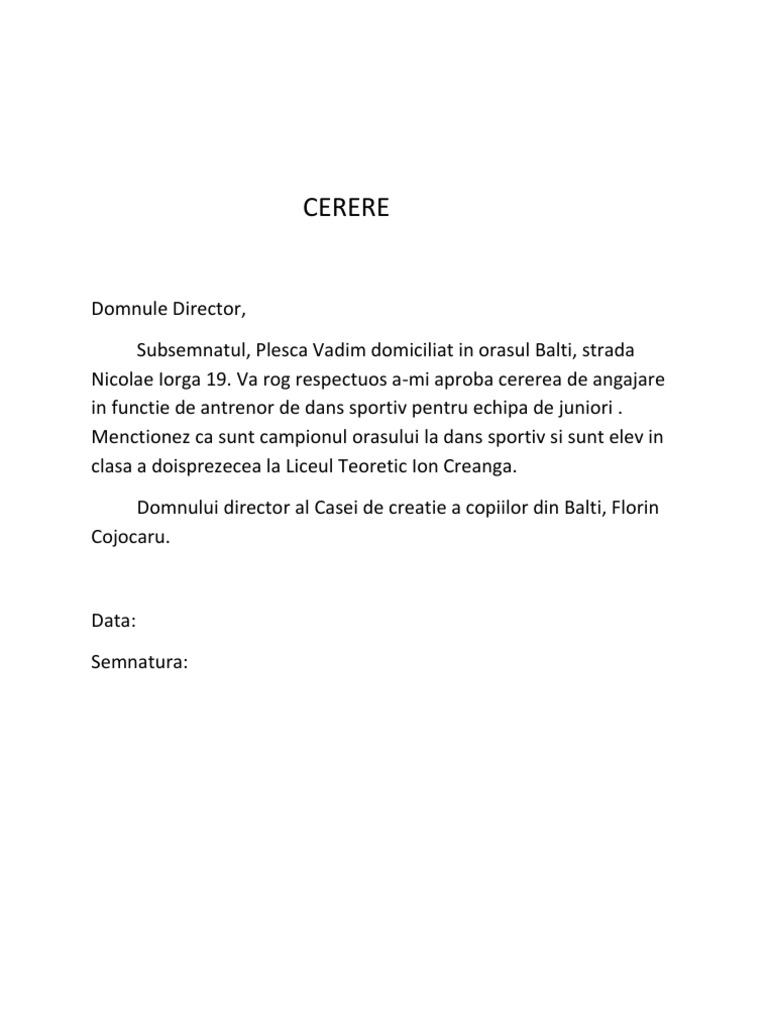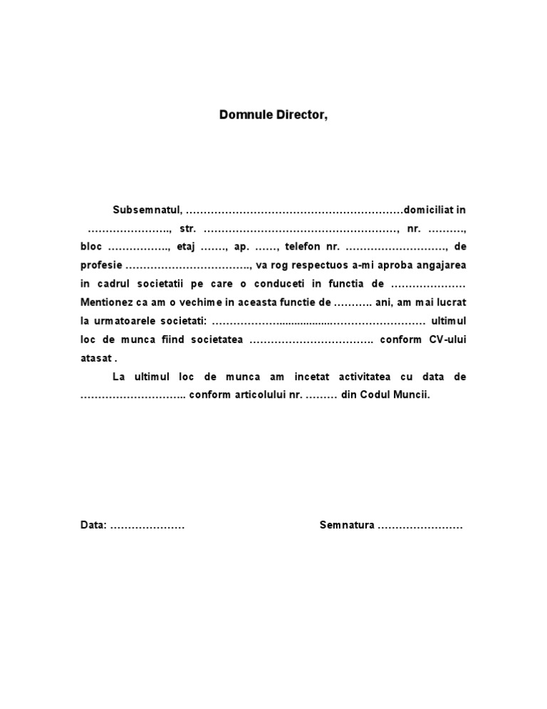 Domnule Director Model De Cerere De Angajare