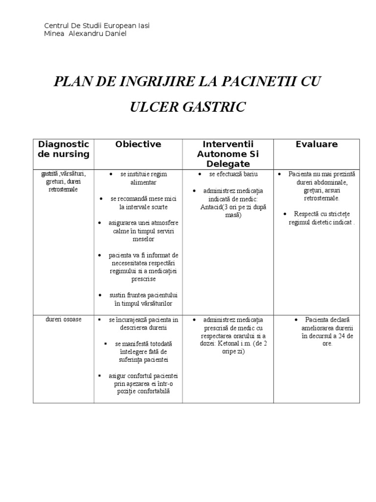 Plan De Ingrijire A Bolnavului Cu Ulcer Gastric