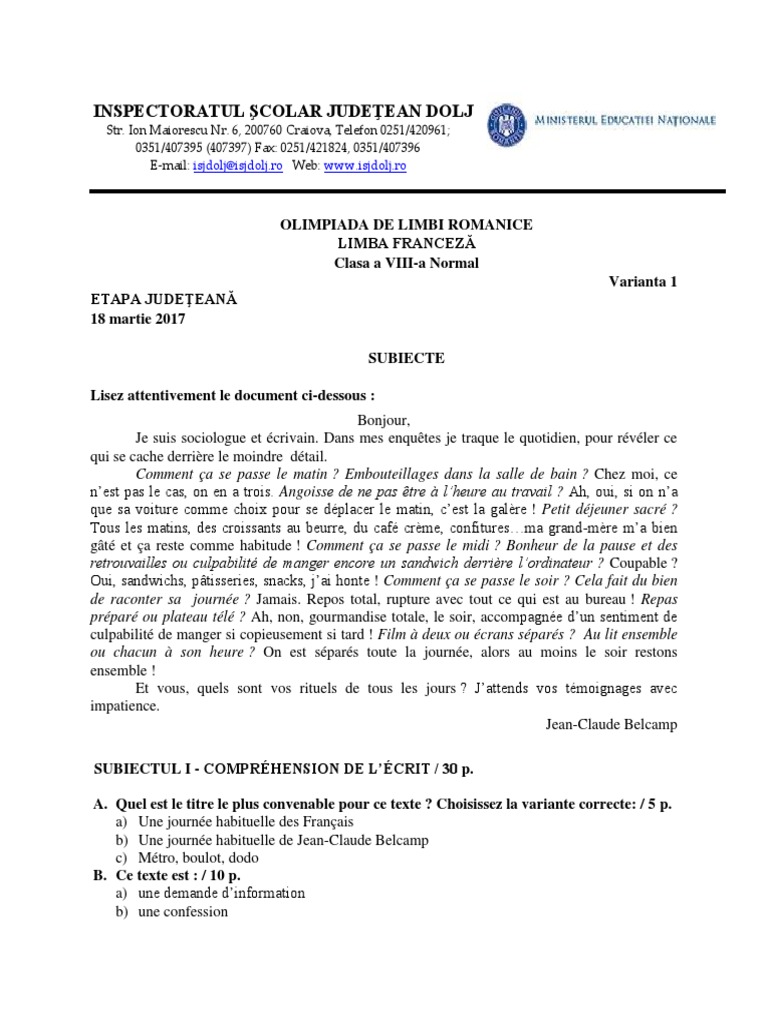 Variante Subiecte Olimpiada De Limba Franceză 2017 A R P F Dolj