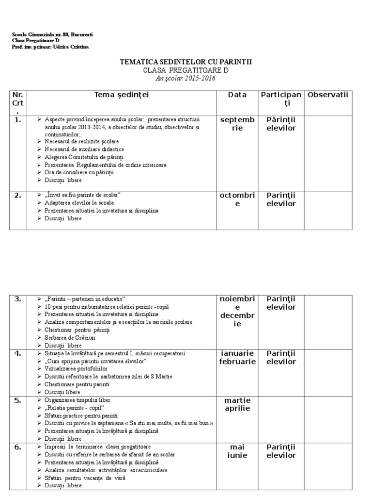 Tematica Sedintelor Cu Parintii