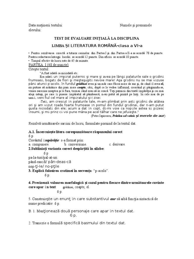 Clasa A Iv A Test Initial Limba Roman